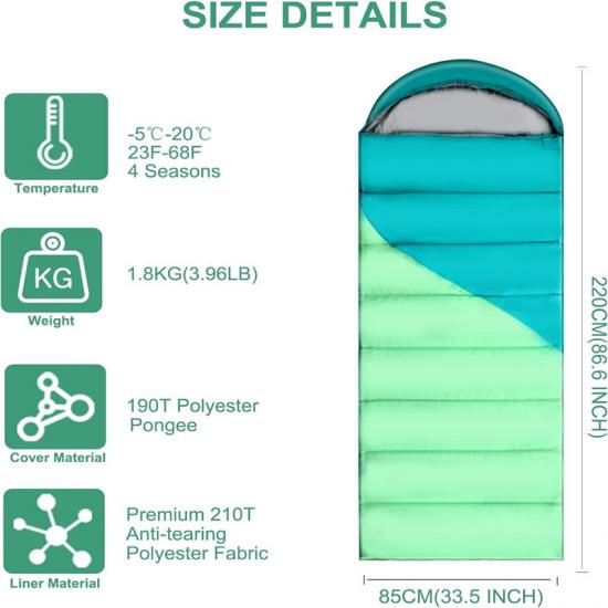 Sac de couchage imperméable de 86,6 x 33,5 pouces/220 x 85 cm et pesant 1,8 kg/3,96 lb, le sac de couchage en polyester est à la fois léger et offre beaucoup de chaleur.