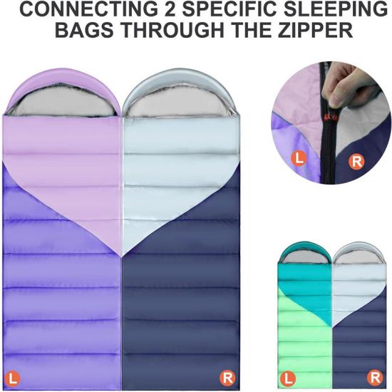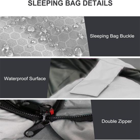 Le sac de couchage en polyester de 1,8 kg / 3,96 lb est doté de fermetures à glissière double face de haute qualité qui ne s'accrochent pas, et les pieds ont des fermetures à glissière réglables pour réguler la quantité d'air chaud ou froid qui entre ou sort du sac. Cela signifie qu'il peut être ajusté pour répondre aux besoins individuels de différents environnements et températures. Vous pouvez même utiliser le sac de couchage entièrement ouvert comme couverture, ce qui augmente considérablement sa polyvalence et sa praticité.