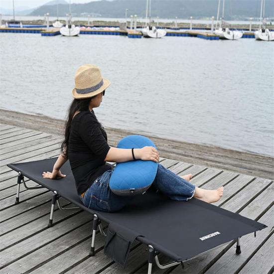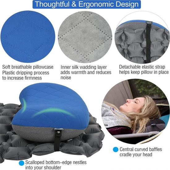 Oreillers gonflables anti-sismiques. Fabriqués en fibre de polyester respirante, ils sont doux au toucher et confortables au contact du visage. Le rembourrage supérieur améliore la chaleur et évacue l'humidité. La taie d'oreiller est lavable à la main et en machine, ce qui facilite son nettoyage et son rangement. Dotés de sangles élastiques boutonnées, les oreillers gonflables anti-sismiques sont fixés à un matelas de sol ou à un hamac pour minimiser les risques de glissement.