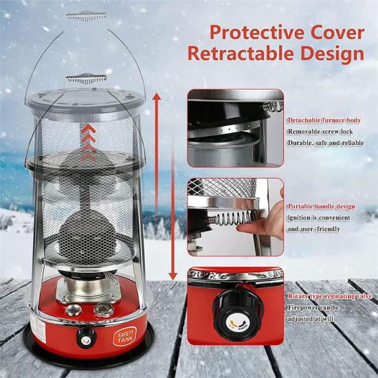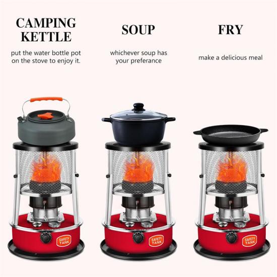 Commodité et polyvalence : Ce poêle à pétrole se distingue par sa grande fonctionnalité et sa facilité de transport. Doté d'une hotte réglable en hauteur, il permet de régler facilement la chaleur selon les besoins et d'accélérer la cuisson. Sa poignée légère facilite son transport et son déplacement, vous permettant ainsi de profiter pleinement de la chaleur qu'il diffuse, à l'intérieur comme à l'extérieur. De plus, sa conception multifonctionnelle lui permet non seulement de chauffer, mais aussi de faire bouillir, cuire et même griller, répondant ainsi à tous vos besoins, que ce soit pour vos activités intérieures ou extérieures en hiver.