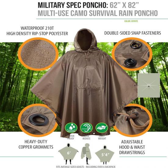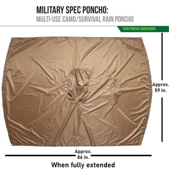 La doublure de poncho avec un indice d'imperméabilité de 3 000 mm est fabriquée en polyester ripstop haute densité et en tissu enduit de polyuréthane avec un excellent indice d'imperméabilité de 3 000 mm. Le poncho mesure environ 59" de largeur et 86" de longueur totale, suffisamment large pour accueillir des sacs à dos plus grands. Le sac de transport mesure environ 6" x 8" x 3". Son poids total est de 18 onces et la capuche à cordon réglable offre un ajustement sûr et confortable. Le poncho est également doté d'un cordon de serrage réglable avec une ouverture de capuche de 9 pouces de diamètre, ce qui permet à l'utilisateur de l'ajuster facilement selon ses besoins.