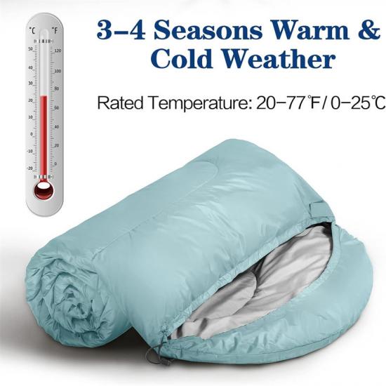 R : La taille du sac de couchage est de 31,5'*87", la conception rectangulaire spacieuse offre un confort maximal et convient pour 3 à 4 saisons.