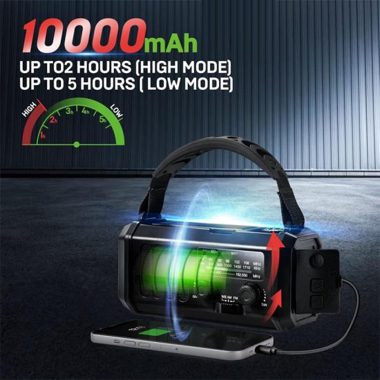 A : Cette radio de sauvetage d'urgence durable dispose d'une batterie rechargeable intégrée de 10 000 mAh, d'une réception radio NOAA et AM/FM, d'une lampe de poche d'urgence, d'une lampe de lecture, d'une alarme SOS et d'une boussole.