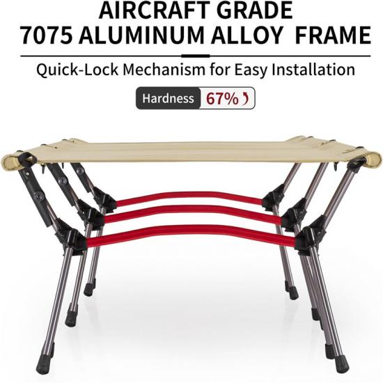 Le cadre de notre lit pliant d'urgence de 2,2 kg est soigneusement fabriqué en alliage d'aluminium 7075 de qualité aéronautique, un matériau reconnu pour sa légèreté et sa robustesse. Il soutient facilement l'ensemble de la structure du lit, garantissant stabilité et sécurité pendant l'utilisation. La surface du lit est en tissu Oxford 600D respirant et indéchirable, durable et résistant à l'usure, mais aussi à l'humidité et à la chaleur, pour un sommeil confortable dans tous les environnements.