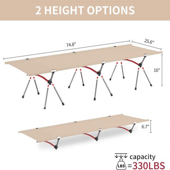 Notre lit pliant portable pour fournitures d'urgence est doté de nombreuses fonctionnalités pratiques. Il offre deux hauteurs : la hauteur basse de 17 cm est adaptée à une utilisation sous tente ou sur sol ferme, tandis que la hauteur haute de 40 cm est adaptée aux sols herbeux, boueux et humides. Conçu pour s'adapter à tous les terrains complexes, il vous assure un sommeil paisible et serein. De plus, il est doté d'un système de verrouillage rapide qui facilite le déverrouillage et le verrouillage d'une seule main. De plus, il est équipé de tubes de corde amortissant les chocs, ce qui améliore non seulement sa stabilité, mais simplifie également son installation et son retrait.