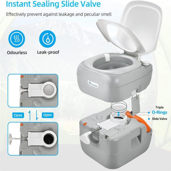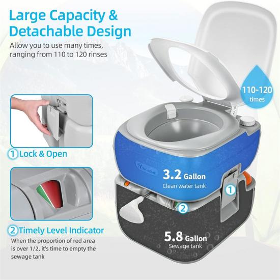 Toilettes d'urgence haute densité Caractéristiques Grande capacité réutilisable : Cette toilette d'urgence haute densité est équipée d'un réservoir d'eau douce de 3,2 gallons/12 litres et d'un réservoir d'eaux usées de 2,6 gallons/10 litres, ce qui garantit une utilisation multiple et vous fait gagner du temps et de l'eau.