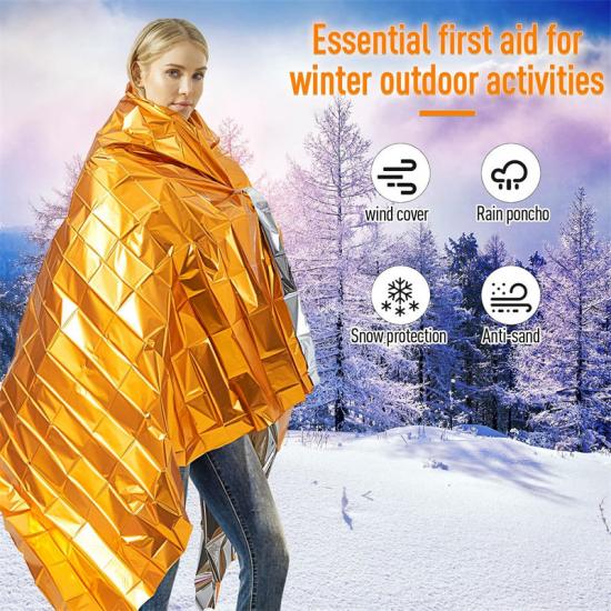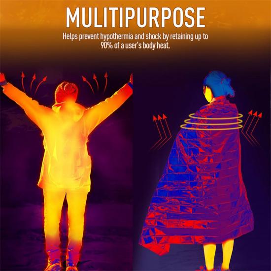 Fabriqué à partir d'un film PET aluminisé, il s'agit d'un kit de survie pratique ; il recouvre entièrement le corps, évitant ainsi l'hypothermie et les chocs en retenant jusqu'à 90 % de la chaleur corporelle de l'utilisateur.