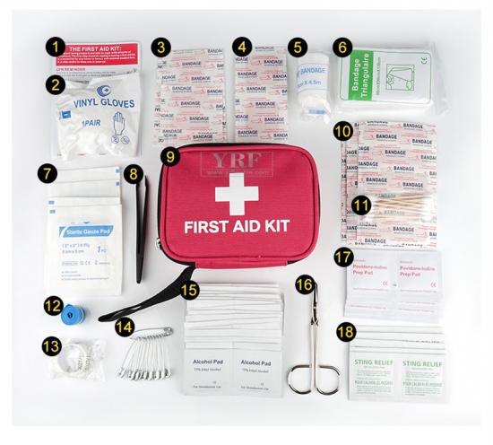 Instructions *1, gants en PVC *1, pansement papillon *5, pansement carré *5, bandage PBT *1, bandage triangulaire *1, morceau de gaze *5, pince à épiler *1, trousse de premiers soins *1, pansement rectangulaire *20, sachet de coton-tige *1, garrot *1, ruban adhésif non tissé *1, épingle de sûreté *10, comprimés d'alcool *40, ciseaux *1, comprimés d'iodophore *10, comprimé de Zhiyang *10