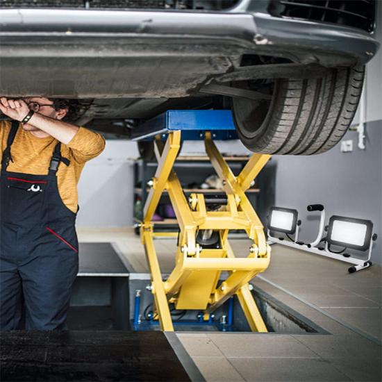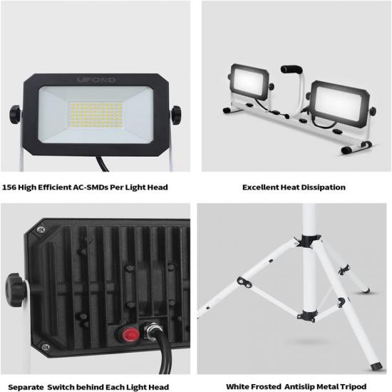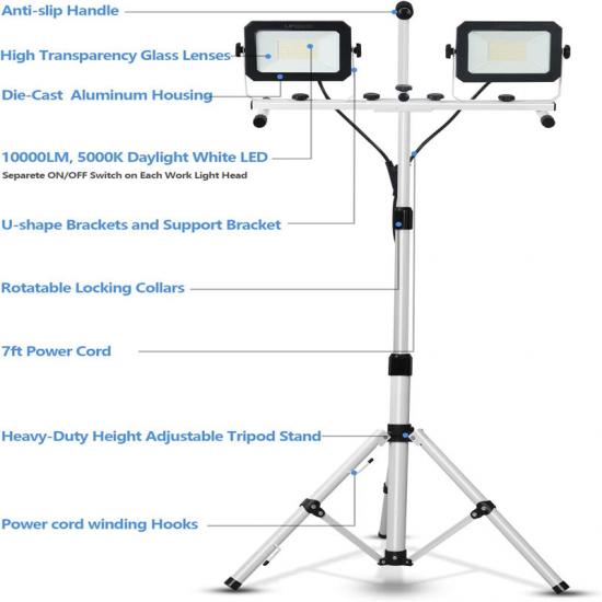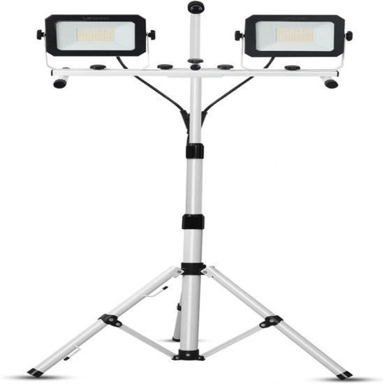 L'éclairage de secours offre une puissance de 5 000 lumens par culot et une lumière blanche flash de 5 000 K. Le trépied télescopique s'étend de 84 cm à 178 cm. Chaque tête pivote à 360° horizontalement et s'incline à 270° verticalement pour ajuster l'angle d'éclairage souhaité. La lampe de travail à double tête avec poignée est amovible pour une utilisation autonome, éliminant ainsi le besoin de trépied.