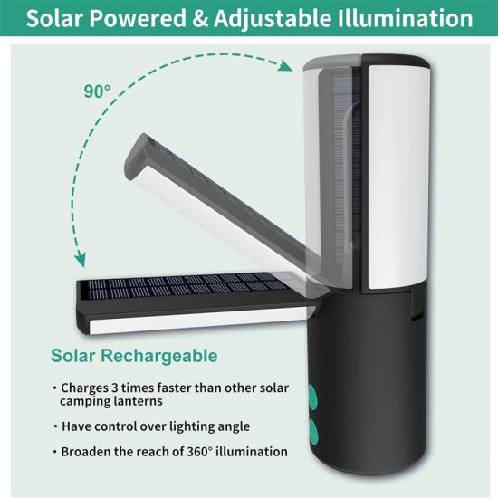Conception à 90° de trois panneaux solaires réglables : la lampe de secours portable militaire est équipée de 3 panneaux solaires réglables, non seulement elle peut être chargée par l'énergie solaire, mais sa conception réglable vous permet également d'étendre facilement la couverture de l'éclairage à 360° et d'ajuster l'angle d'éclairage selon vos besoins.