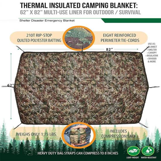 R : La couverture doublée imperméable peut être utilisée à diverses fins telles que les tentes de survie temporaires, les parasols, les matériaux d'isolation de hamac, les oreillers, les cloisons de tente, les écrans de confidentialité, les outils de transport d'urgence, les outils de secours en cas de catastrophe, les abris cachés, les sacs à main de transport, les sacs de couchage ou les matériaux d'isolation de tente.