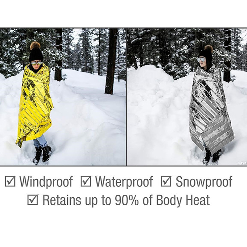 La couverture thermique double face plaquée aluminium retient jusqu'à 90 % de la chaleur corporelle, idéale pour une utilisation dans des situations de survie d'urgence, imperméable, coupe-vent et résistante à l'humidité pour vous aider à rester au sec dans des conditions humides, pluvieuses et froides.