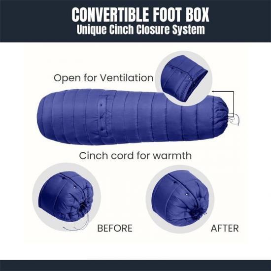 Cette couette supérieure peut également être utilisée comme sac de couchage dans son coussin de pied convertible, conçu pour améliorer la chaleur, le confort et l'efficacité en fournissant une isolation supplémentaire pour vos pieds. Lors des nuits plus chaudes, vous avez la possibilité d'ouvrir la semelle intérieure pour une meilleure circulation de l'air. Dans des conditions plus froides, attacher fermement les cordons permet d'obtenir une chaleur optimale. Qu'il s'agisse d'une nuit chaude ou d'un environnement de sommeil froid, ce sac de couchage Rescue Equipment offre confort et commodité.