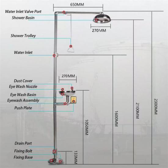 Ce lave-yeux de douche militaire confortable présente des dimensions compactes de 65 x 230 cm, adaptées à une installation intérieure comme extérieure. Son grand bac de douche en acier inoxydable, associé à une technologie de pulvérisation répartie, élargit efficacement la zone de pulvérisation pour un débit d'eau plus large, répondant ainsi à vos besoins de lavage oculaire pendant 15 minutes.