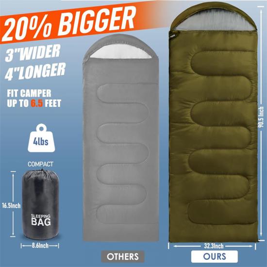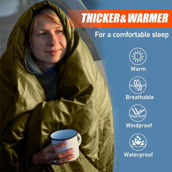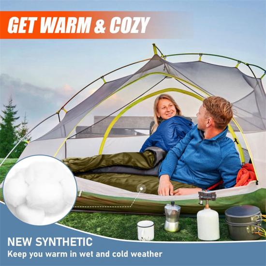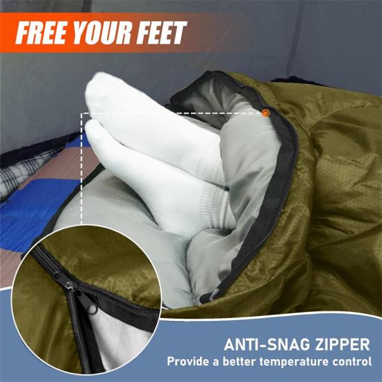 Le tissu extérieur du sac de couchage militaire est en polyester 210T imperméable, ce qui le protège du vent et de la pluie et vous garde au chaud même par temps froid. De plus, l'intérieur du sac de couchage Durable est doté d'un nouveau rembourrage isolant synthétique qui assure une excellente isolation même par temps humide, évitant ainsi toute sensation d'humidité.