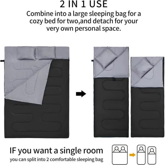 La taille du sac de couchage pour le soulagement des inondations est de 63*86,6 "/160*230CM, et la conception rectangulaire spacieuse offre un confort maximal, adapté à 3-4 saisons, et la température nominale est de 5℃-25℃.