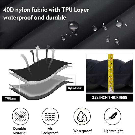 Notre matelas de couchage gonflable robuste et durable est fabriqué en nylon 40D avec un revêtement en TPU pour une résistance accrue aux déchirures.