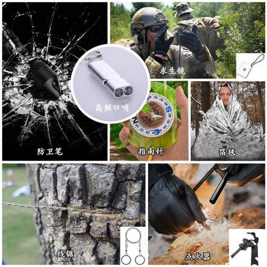 survie équipement, tel que des couvertures de survie, des ciseaux, des sifflets et une carte de poche multifonction, à main appuyer sur flash